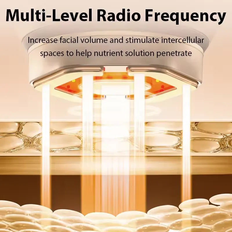 The device emits 1 MHz RF waves combined with red light therapy to penetrate deep into the dermis, stimulating cellular restructuring and accelerating collagen production. This powerful combination helps to reduce fine lines, tighten loose skin, and restore a youthful, plump appearance. With regular use 2–3 times per week, the skin becomes visibly smoother, firmer, and more radiant.